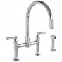 Perrin & Rowe - Io 2 hole bench mounted sink mixer with round spout, metal lever taps & spray rinse Unit Code: AU42733